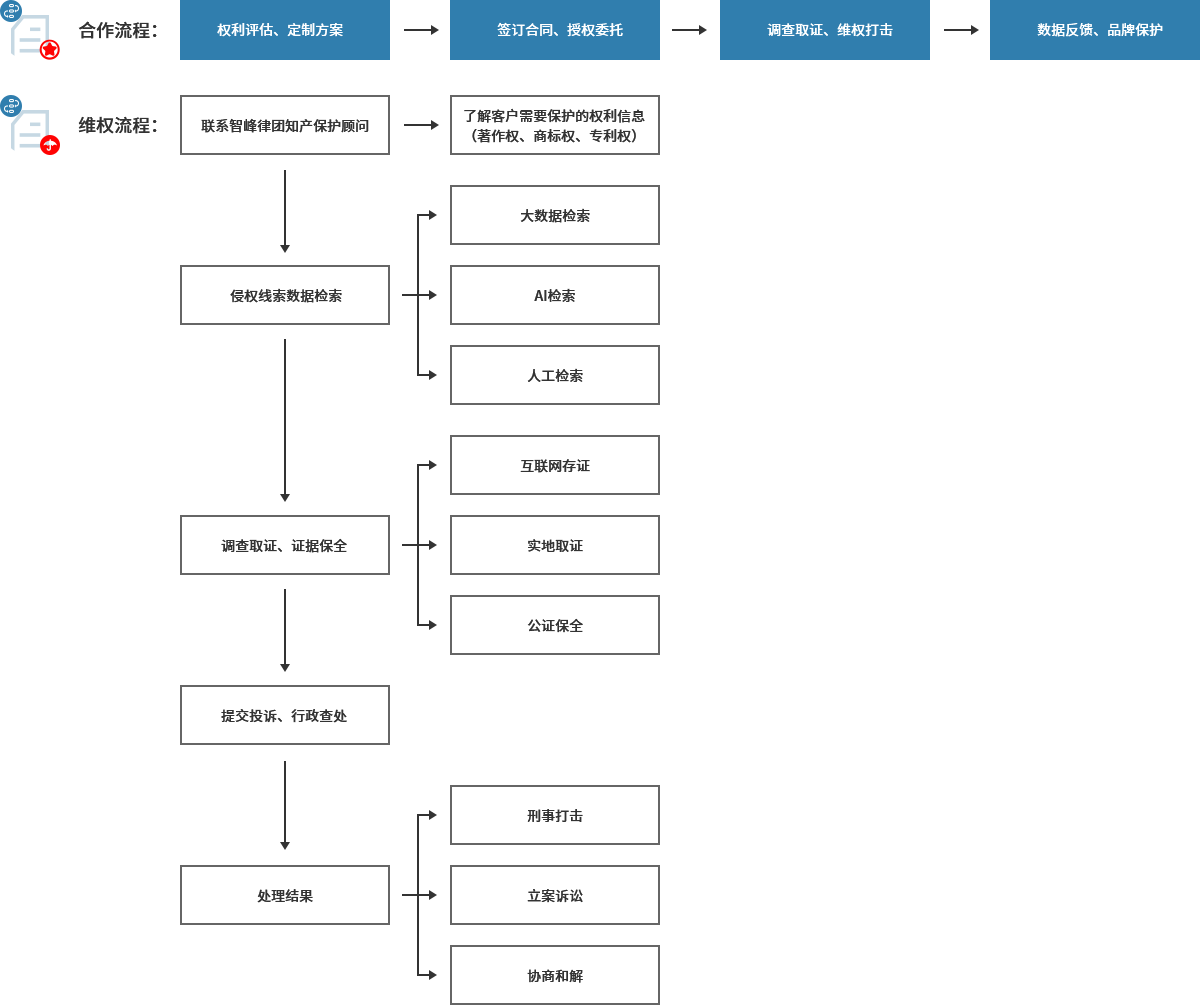 智峰律团在知识产权保护方面,已建立一套完备的搜索、调查、打击、诉讼、复查的服务体系,追溯假冒源头,稳定的侵权线索获取渠道,为企业提供刑事维权、行政维权、诉讼维权的全方位一体化服务。